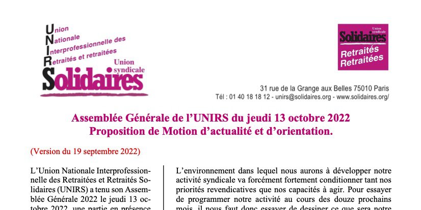 Publié le 20 septembre 2022 par UNIRS - Union nationale interprofessionnelle des retraité-es solidaires
