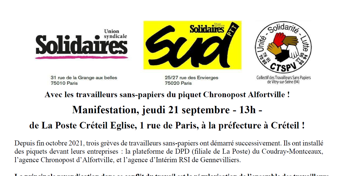 La prochaine manifestation des camarades du piquet Chronopost aura lieu jeudi 21 septembre, 13H, de la Poste Créteil Eglise (1 rue de Paris, bus TVM Eglise de Créteil) jusqu'à la préfecture. La lutte continue.