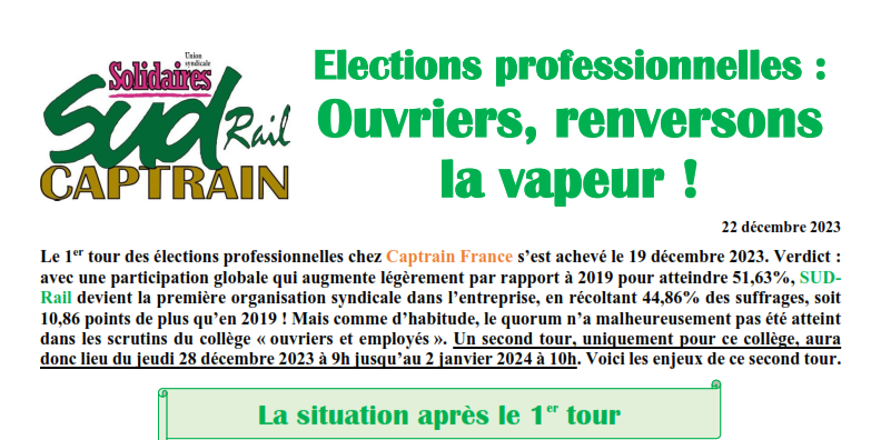 Mais comme d’habitude, le quorum n'a malheureusement pas été atteint dans les scrutins du collège « ouvriers et employés ». Un second tour, uniquement pour ce collège, aura donc lieu du jeudi 28 décembre 2023 à 9 h jusqu'au 2 janvier 2024 à 10h. Dans ce tract, vous trouverez les enjeux de ce second tour.