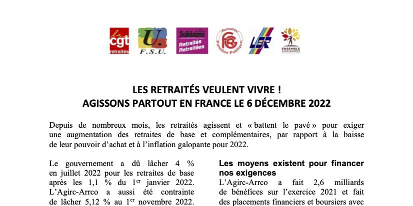 Nous appelons, le 6 décembre, à multiplier les initiatives dans tous les territoires, devant les sièges du Medef et des préfectures, dans des formes variées, afin d’être les plus visibles possible auprès des décideurs et de l’opinion publique, pour exiger une hausse des retraites complémentaires de 6,2 % pour l’année 2022.