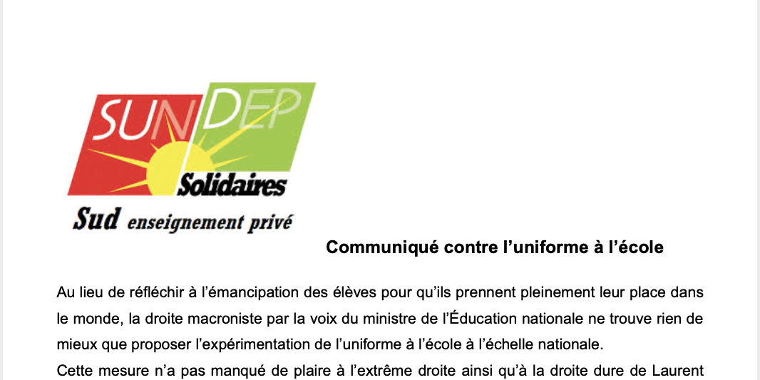 Au lieu de réfléchir à l’émancipation des élèves pour qu’ils prennent pleinement leur place dans le monde, la droite macroniste par la voix du ministre de l’Éducation nationale ne trouve rien de mieux que proposer l’expérimentation de l’uniforme à l’école à l’échelle nationale.