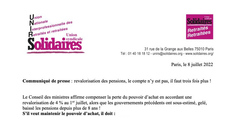 Au-delà de ces mesures de rattrapage du pouvoir d’achat, Solidaires revendique, avec les 9 organisations de retraité·e·s CGT, FO, CFTC, CFE-CGE, FSU, Solidaires, FGR-FP, UNRPA Ensemble & solidaires, LSR l’indexation des pensions selon le salaire moyen et une pension au minimum au SMIC.