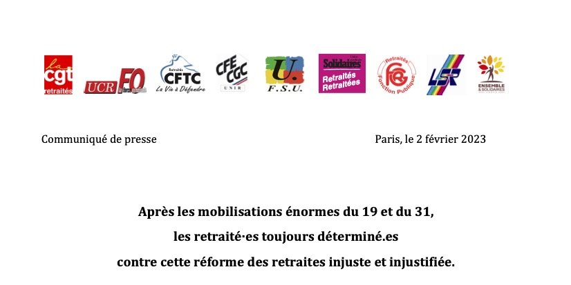 Nos neuf organisations de retraitées et de retraités appellent toutes et tous à répondre au mot d’ordre de l’intersyndicale nationale et à manifester dans la rue, partout dans le pays, le mardi 7 et le samedi 11 février 2023.