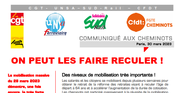 Conscientes de l’effort continu et soutenu des cheminotes et des cheminots, les fédérations cheminotes CGT, UNSA-Ferroviaire, SUD-Rail et CFDT appellent tous les cheminots du GPU à se joindre aux actions organisées dans les territoires et à se mettre massivement en grève le 6 avril dans le mouvement intersyndical.