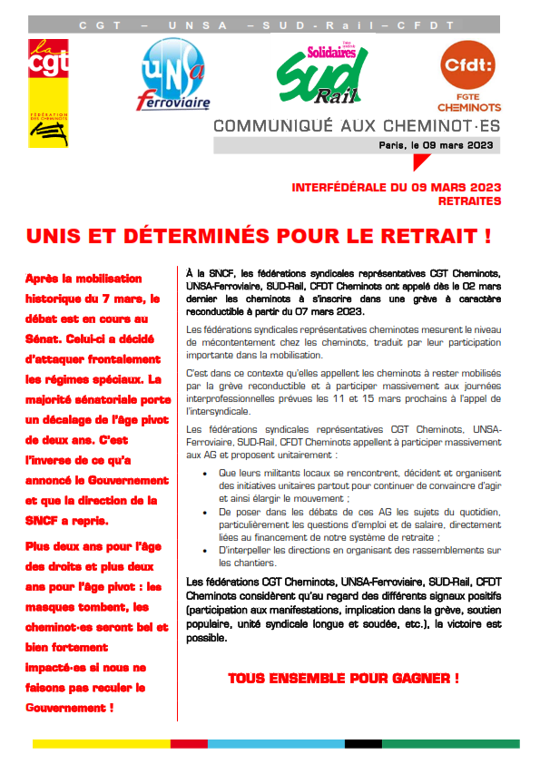 Les fédérations syndicales représentatives CGT Cheminots, UNSAFerroviaire, SUD-Rail, CFDT Cheminots appellent à participer massivement aux AG et proposent unitairement :