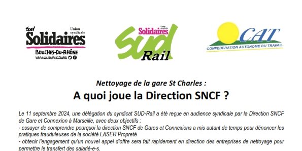 Le 11 septembre 2024, une délégation du syndicat SUD-Rail a été reçue en audience syndicale par la Direction SNCF de Gare et Connexion à Marseille, avec deux objectifs :