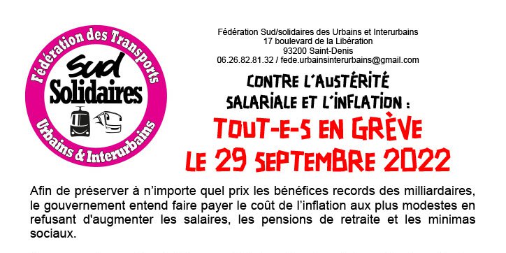 Il est maintenant temps de passer la vitesse supérieure, c’est pourquoi la Fédération Sud/Solidaires des Transports Urbains et Interurbains appelle l'ensemble des salarié-e-s à participer à la grève interprofessionnelle du 29 septembre 2022.