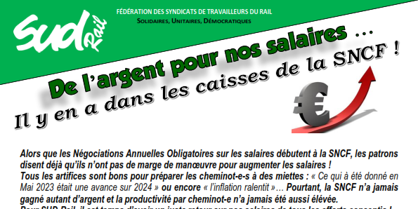 Tous les artifices sont bons pour préparer les cheminot-e-s à des miettes : « Ce qui à été donné en Mai 2023 était une avance sur 2024 » ou encore « l’inflation ralentit »… Pourtant, la SNCF n’a jamais gagné autant d’argent et la productivité par cheminot-e n’a jamais été aussi élevée. Pour SUD-Rail, il est temps d’avoir un juste retour sur nos salaires de tous les efforts consentis !