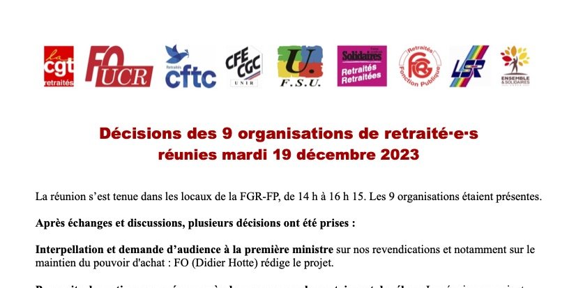 Voici le relevé de décisions des 9 organisations de retraité·es et, en document à télécharger, le compte-rendu complet de cette réunion.