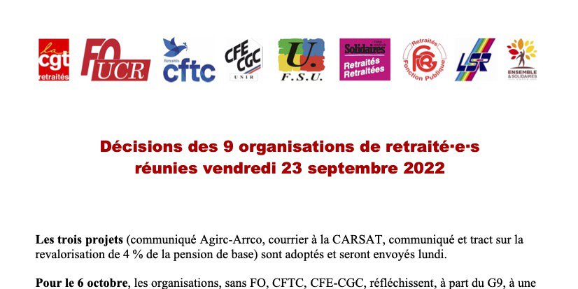 - Prochaine réunion des 9 organisations lundi 17 octobre pour faire le bilan de toutes ces initiatives, décider d’une action des retraité·e·s sur le PLFSS, reprendre contact avec les organisations de jeunes, re-travailler avec nos organisations de santé…