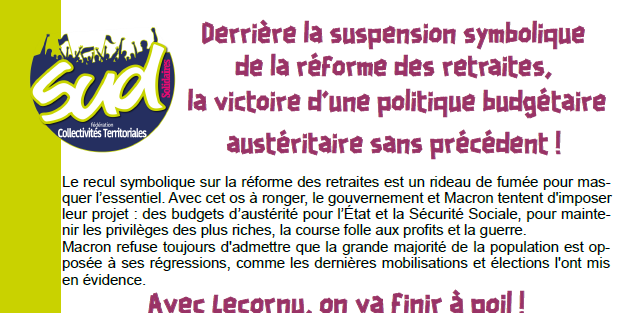 Le recul symbolique sur la réforme des retraites est un rideau de fumée pour masquer l’essentiel. Avec cet os à ronger, le gouvernement et Macron tentent d'imposer leur projet : des budgets d’austérité pour l’État et la Sécurité Sociale, pour maintenir les privilèges des plus riches, la course folle aux profits et la guerre. Macron refuse toujours d'admettre que la grande majorité de la population est op-posée à ses régressions, comme les dernières mobilisations et élections l'ont mis en évidence.