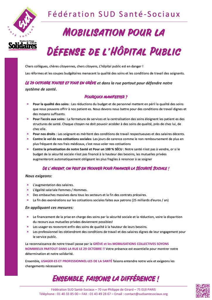 ENSEMBLE, LE 29 OCTOBRE 2024 POUR FAIRE ENTENDRE NOS REVENDICATIONS ET DÉFENDRE UNE PRISE EN CHARGE DE QUALITÉ, ACCESSIBLE DANS LA PROXIMITÉ POUR TOUTE LA POPULATION !