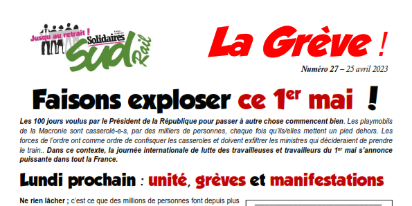 Les 100 jours voulus par le Président de la République pour passer à autre chose commencent bien. Les playmobils de la Macronie sont casserolé-e-s, par des milliers de personnes, chaque fois qu’ils/elles mettent un pied dehors. Les forces de l’ordre ont comme ordre de confisquer les casseroles et doivent exfiltrer les ministres qui décideraient de prendre le train.. Dans ce contexte, la journée internationale de lutte des travailleuses et travailleurs du 1er mai s’annonce puissante dans tout la France.