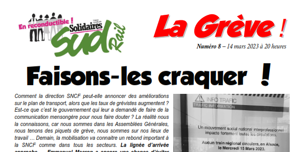 Ce mercredi 15 mars nous allons retourner très massivement dans la rue … et il va falloir y rester encore le 16 mars. Des actions, rassemblements, manifestations … sont déjà prévues pour jeudi. La fédération SUD-Rail appelle les cheminotes et cheminots à y participer massivement. Mettons la pression sur tous les lieux de pouvoir dans les départements. Retrouvons-nous encore plus nombreux-ses dans les Assemblées Générales pour renforcer notre détermination … et aller chercher la victoire !