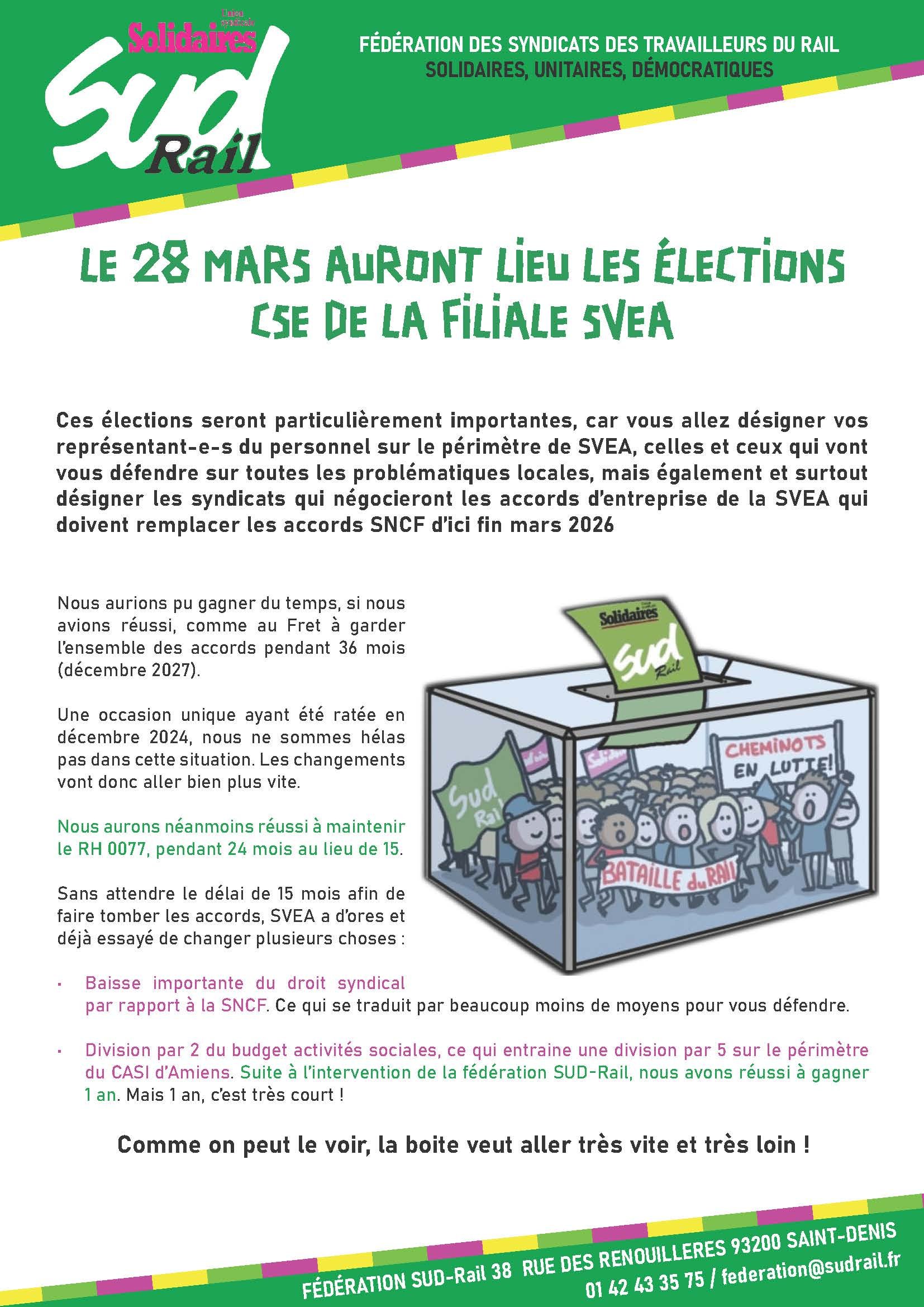Ces élections seront particulièrement importantes, car les cheminotes et les cheminots de la nouvelle filiale SNCF vont désigner leurs représentant-e-s du personnel sur le périmètre de SVEA, celles et ceux qui vont vous défendre sur toutes les problématiques locales, mais également et surtout désigner les syndicats qui négocieront les accords d’entreprise de la SVEA qui doivent remplacer les accords SNCF d’ici fin mars 2026
