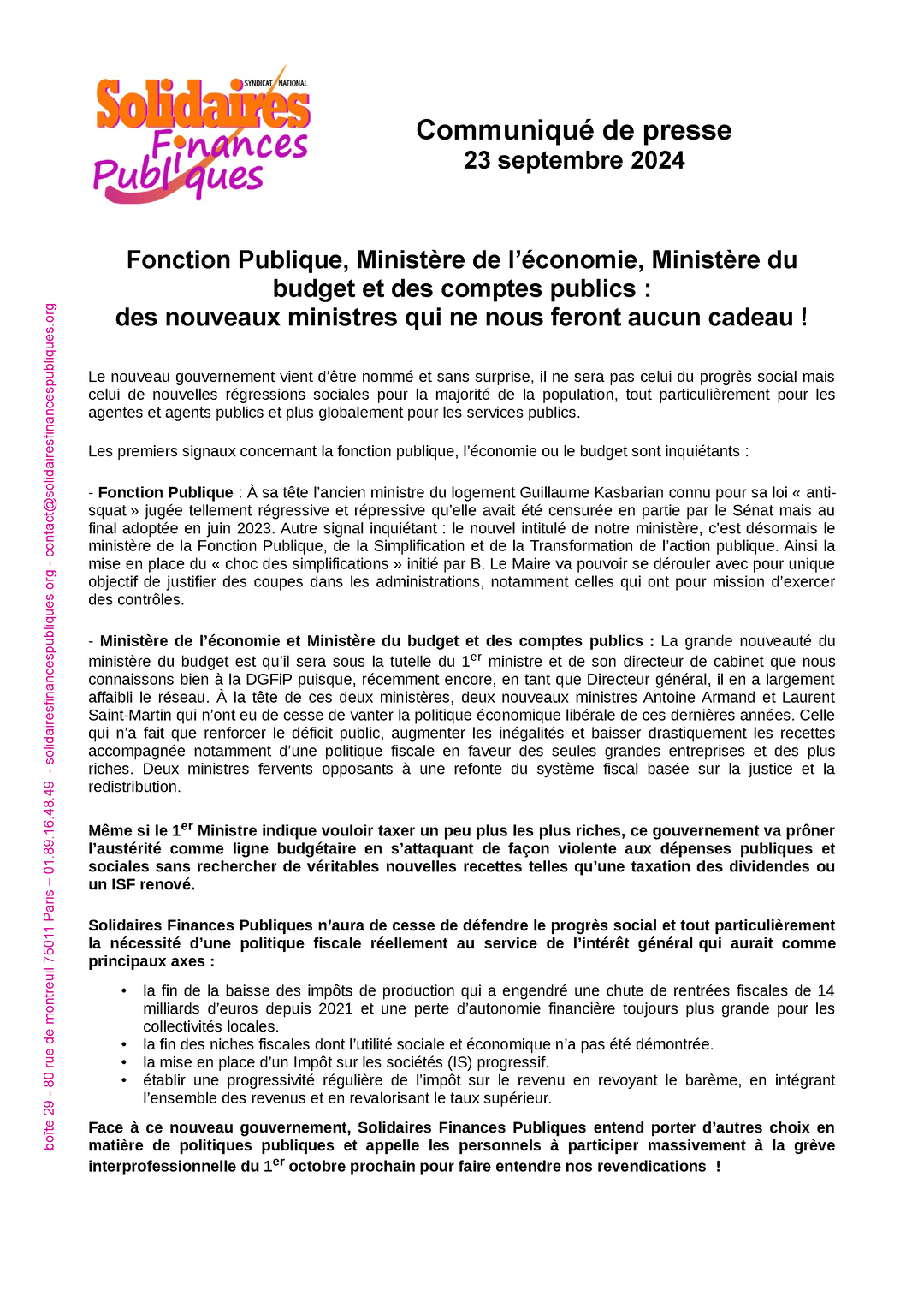 Face à ce nouveau gouvernement, Solidaires Finances Publiques entend porter d’autres choix en matière de politiques publiques et appelle les personnels à participer massivement à la grève interprofessionnelle du 1er octobre prochain pour faire entendre nos revendications !