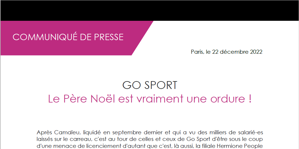 Après Camaïeu, liquidé en septembre dernier et qui a vu des milliers de salarié-es laissés sur le carreau, c'est au tour de celles et ceux de Go Sport d'être sous le coup d'une menace de licenciement d'autant que c'est, là aussi, la filiale Hermione People & Brands (HPB) du groupe FIB qui est aux commandes.
