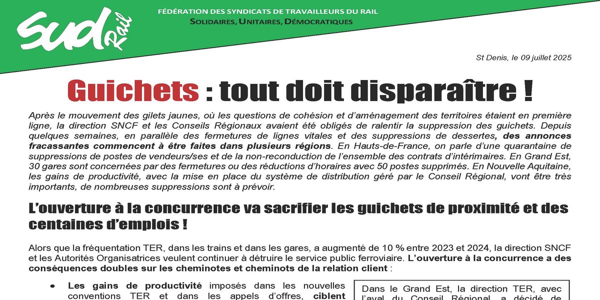 Dans le Grand Est, la direction TER, avec l’aval du Conseil Régional, a décidé de saccager le réseau de vente et de piétiner les conditions de travail des vendeurs/ses. Sur les 13 gares dont la fermeture est annoncée, un partenariat avec La Poste sera conclu pour 10 gares. La fédération SUD-Rail, avec nos camarades de SUD PTT, prépare la mise en place d’une riposte syndicale commune.