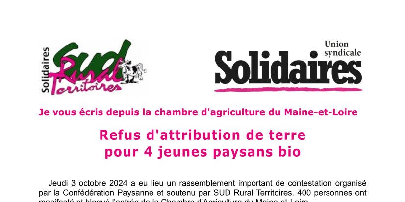 Jeudi 3 octobre 2024 a eu lieu un rassemblement important de contestation organisé par la Confédération Paysanne et soutenu par SUD Rural Territoires. 400 personnes ont manifesté et bloqué l'entrée de la Chambre d'Agriculture du Maine-et-Loire.