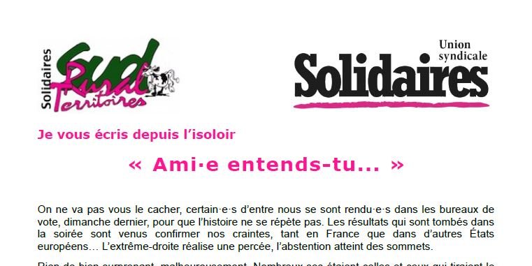 Aujourd’hui, passée la « gueule de bois » de dimanche soir, après les résultats, il faut nous organiser et réagir pour riposter face à cette menace qui plane désormais sur nous, bien réelle : menace pour les services publics, menace pour nos conquêtes sociales, menace pour le syndicalisme libre et indépendant, menace pour les femmes et les LGBTQIA+, menace pour celles et ceux qui pensaient trouver refuge en France, menace pour la politique intérieure et extérieure de la France… Trois points de suspension, parce que la liste de toutes celles et ceux qui sont menacé·e·s serait trop longue.