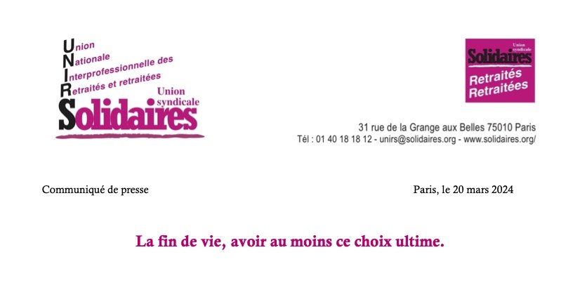 Dans les prochains mois un nouveau débat devrait donc s’ouvrir dans notre pays sur ce droit à mourir dans la dignité. L’UNIRS-Solidaires s’y inscrira en s’opposant notamment très fortement à celles et ceux qui voudraient décider de la fin de vie des autres à la place des autres. La loi que nous demandons, c’est une loi qui ouvre des possibilités aux personnes qui veulent y accéder et qui ne les mette plus « hors la loi ». Elle ne peut obliger quiconque à s’y inscrire et chaque personne qui souhaite laisser faire « la nature » ou « son dieu » doit bien entendu rester libre de son choix.