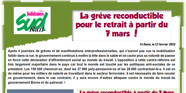 Les 150 000 cheminot·es, dont les 37 000 poly-pensionné·es et les 28 000 contractuel-le-s. Il est en de même pour les milliers de salarié·es travaillant dans le secteur ferroviaire. Il est nécessaire de faire reculer ce gouvernement, dans le cas contraire, il y aura encore d’autres attaques contre le monde du travail du gouvernement Borne et du patronat. !