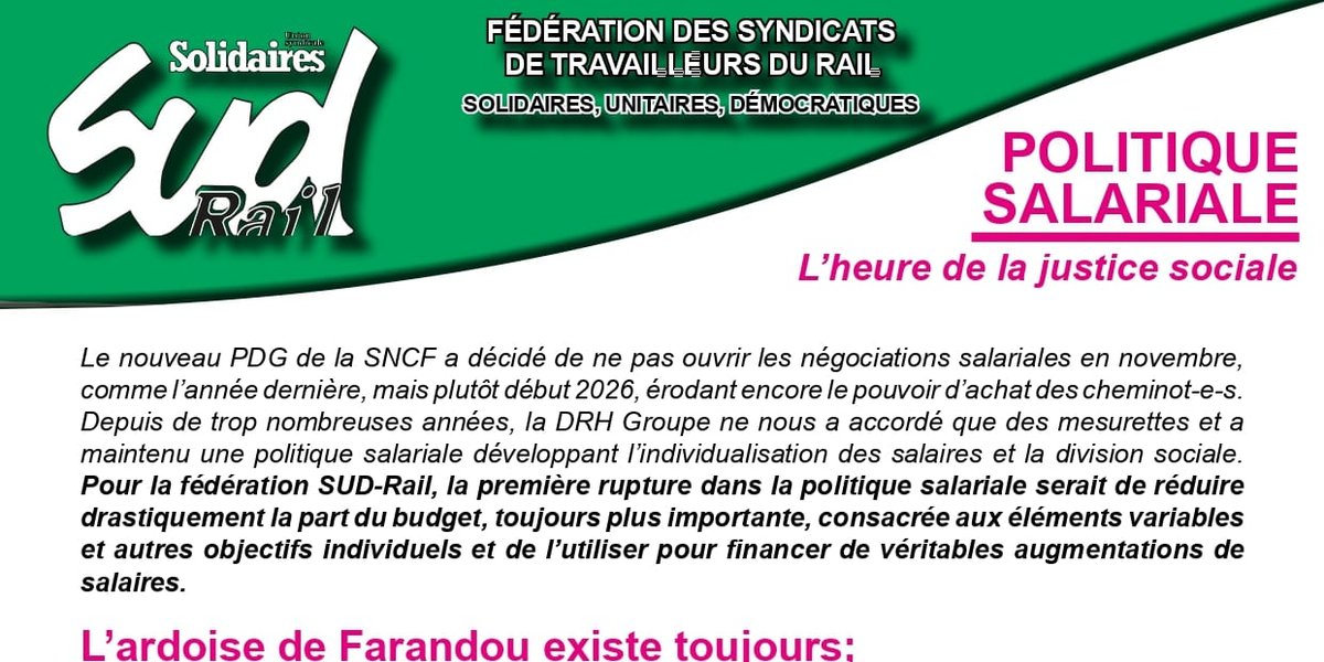Pour la fédération SUD-Rail, la première rupture dans la politique salariale serait de réduire drastiquement la part du budget, toujours plus importante, consacré aux parts variables et autres objectifs individuels et de l’utiliser pour financer de véritables augmentations de salaires.