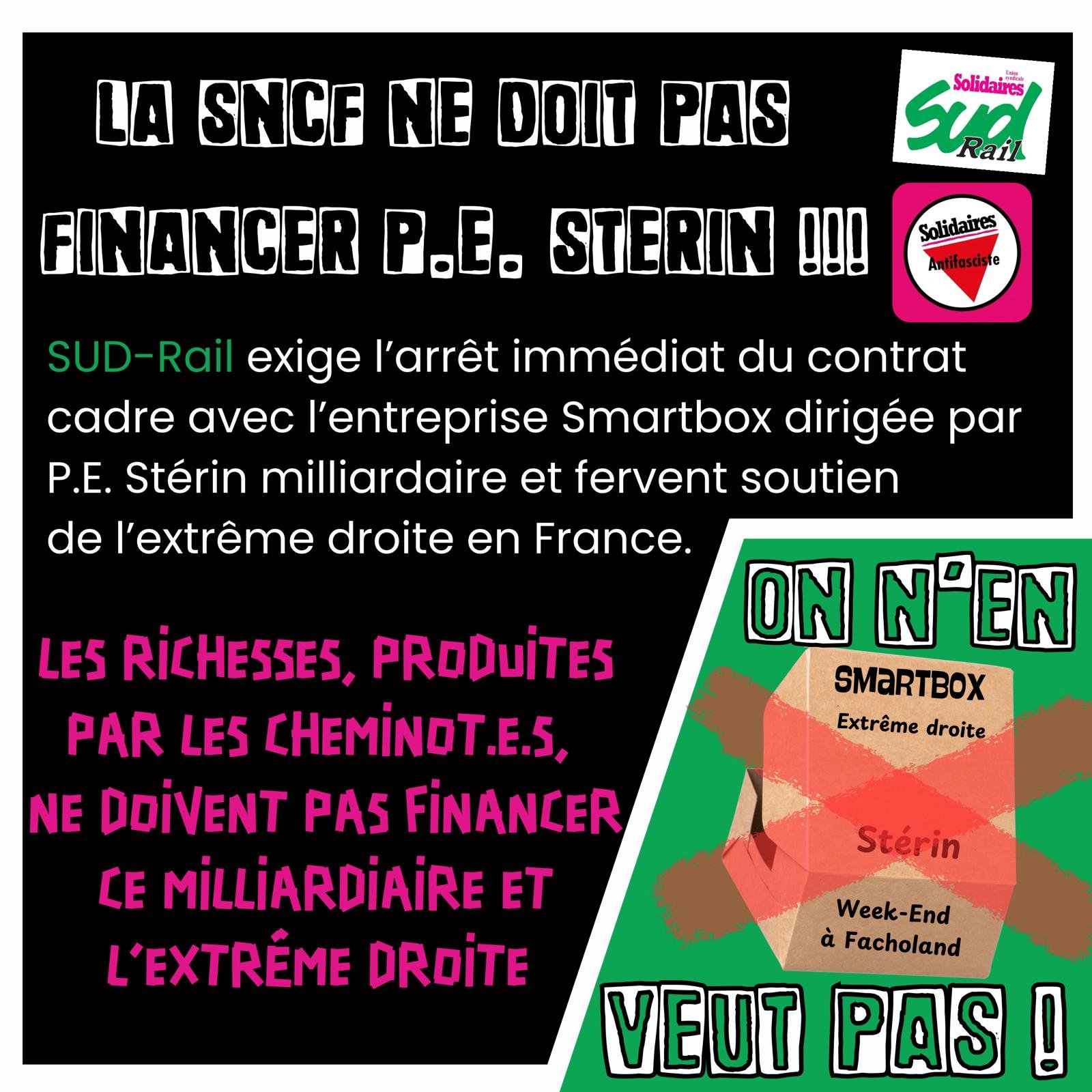 Nous avons appris récemment, à l’occasion d’un mail « adressé à l’ensemble des collaborateurs de l’établissement ESV TGV OUEST de la région Bretagne » que l'entreprise SNCF allait proposer des "Smartbox" lors d'un concours organisé par le groupe RIALTO. Vous n’êtes pas sans savoir que l’entreprise Smartbox a fait la fortune du milliardaire Pierre-Édouard Stérin ; nous refusons que les richesses produites par les cheminotes et cheminots financent ce milliardaire d'extrême-droite.