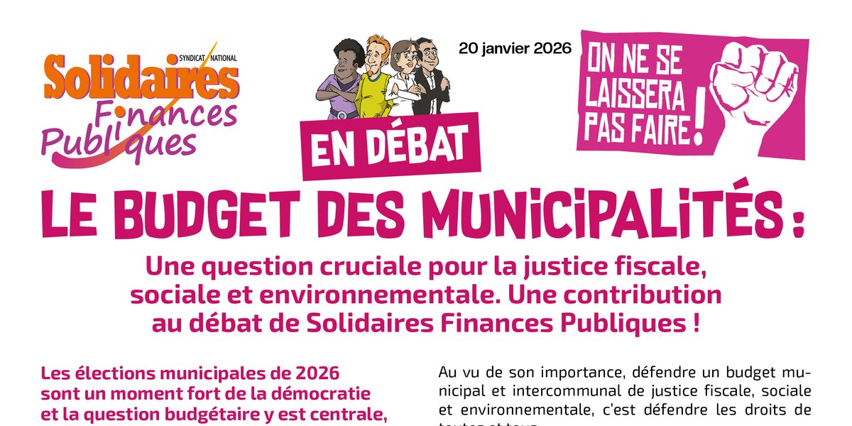 Pour Solidaires Finances Publiques, 1er syndicat de la Direction Générale des Finances Publiques (DGFiP), le budget des municipalités et des intercommunalités n’est pas et ne doit pas être réservé aux spécialistes et aux seuls élus. Il concerne l’ensemble de la population car il conditionne les services publics de proximité, l’égalité entre les habitantes et habitants et c’est un levier central pour la bifurcation écologique des territoires. Par ailleurs, défendre un budget local de justice fiscale, sociale et environnementale ne peut se faire sans défendre la DGFiP, ses agentes et agents et ses missions. En effet, sans un service public des Finances publiques fort et présent de façon pérenne sur l’ensemble des territoires, il ne peut y avoir de justice fiscale ni d’égalité territoriale.