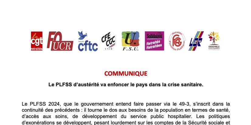 Le PLFSS 2024, que le gouvernement entend faire passer via le 49-3, s’inscrit dans la continuité des précédents : il tourne le dos aux besoins de la population en termes de santé, d’accès aux soins, de développement du service public hospitalier. Les politiques d’exonérations se développent, pesant lourdement sur les comptes de la Sécurité sociale et favorisant le remplacement de la cotisation par l’impôt ce qui conduit à l’étatisation du financement de la Sécurité sociale.