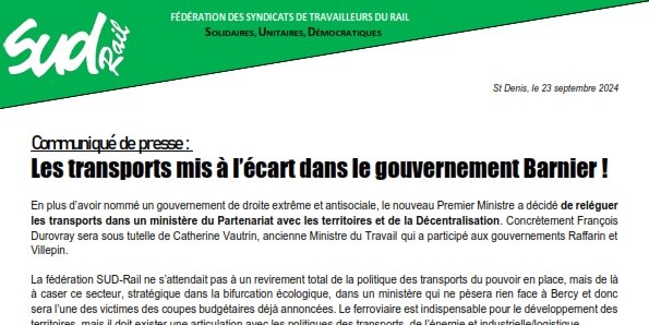 La fédération SUD-Rail ne s’attendait pas à un revirement total de la politique des transports du pouvoir en place, mais de là à caser ce secteur, stratégique dans la bifurcation écologique, dans un ministère qui ne pèsera rien face à Bercy et donc sera l’une des victimes des coupes budgétaires déjà annoncées. Le ferroviaire est indispensable pour le développement des territoires, mais il doit exister une articulation avec les politiques des transports, de l’énergie et industrielle/logistique.