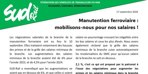 Les négociations salariales de la branche de la manutention ferroviaire ont eu lieu le 10 septembre. Elles traitaient notamment des hausses des primes et de la grille des salaires minimaux de la branche. Les augmentations des salaires minimaux de la branche avaient été de 6% pour l’année 2023, et de 4,5% pour l’année 2024.