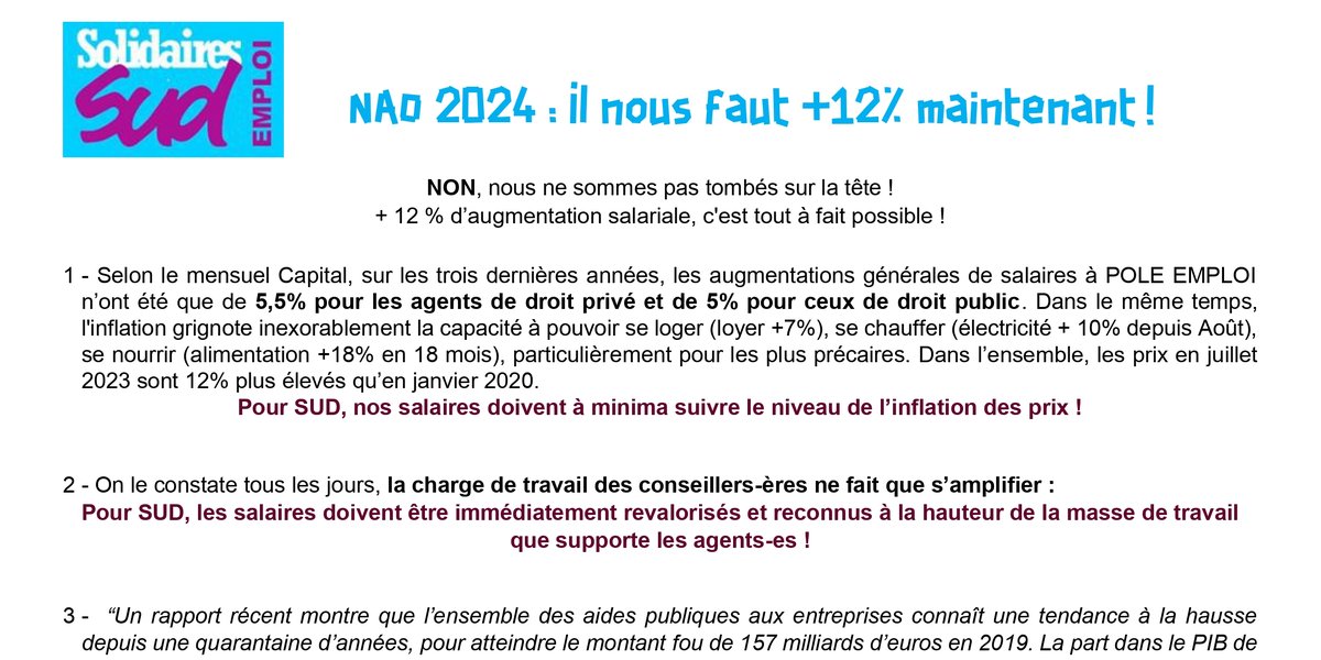 2 - On le constate tous les jours, la charge de travail des conseillers-ères ne fait que s’amplifier : Pour SUD, les salaires doivent être immédiatement revalorisés et reconnus à la hauteur de la masse de travail que supporte les agents-es !