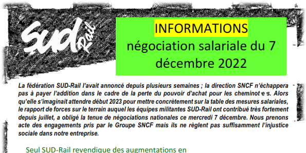 La fédération SUD-Rail l’avait annoncé depuis plusieurs semaines ; la direction SNCF n’échappera pas à payer l’addition dans le cadre de la perte du pouvoir d’achat pour les cheminot·e·s. Alors qu’elle s’imaginait attendre début 2023 pour mettre concrètement sur la table des mesures salariales, le rapport de forces sur le terrain auquel les équipes militantes SUD-Rail ont contribué très fortement depuis juillet, a obligé la tenue de négociations nationales ce mercredi 7 décembre. Nous prenons acte des engagements pris par le Groupe SNCF mais ils ne règlent pas suffisamment l’injustice sociale dans notre entreprise.