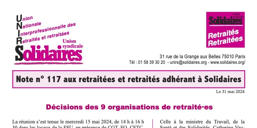 Voici la note mensuelle de l'UNIRS, envoyée à toutes les personnes retraitées dont nous avons les adresses internet.