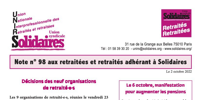 - Le 6 octobre à 13 h, rassemblement national à Paris pour l’augmentation de la pension complémentaire. Venez nombreuses et nombreux !