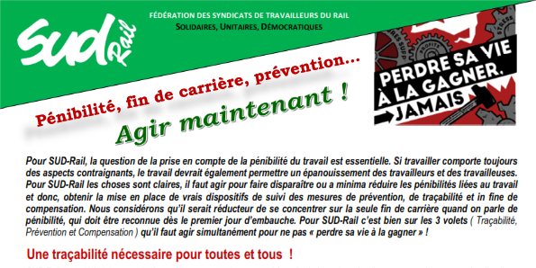 Pour SUD-Rail les choses sont claires, il faut agir pour faire disparaître ou a minima réduire les pénibilités liées au travail et donc, obtenir la mise en place de vrais dispositifs de suivi des mesures de prévention, de traçabilité et in fine de compensation.
