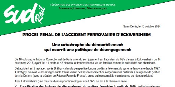 Ce 10 octobre, le Tribunal Correctionnel de Paris a rendu son jugement sur l’accident du TGV d’essai à Eckwersheim du 14 novembre 2015, ayant fait 11 morts et 42 blessés, et traumatisant à vie les familles comme la collectivité des cheminots.