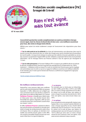 - Sur le volet prévoyance, la Fonction Fublique (FP) n’a toujours pas publié le décret qui prévoit le rôle des complémentaires, pourtant essentiel, par exemple pour la compensation du « demi-traitement » ; Solidaires se bat au niveau FP et avec le ministère des Finances pour que le couplage soit automatique avec la santé, ce qui est un gage de meilleure couverture, de meilleure solidarité et de moindre coût. A noter que le ministre des Finances a confirmé son engagement à agir pour convaincre la FP…