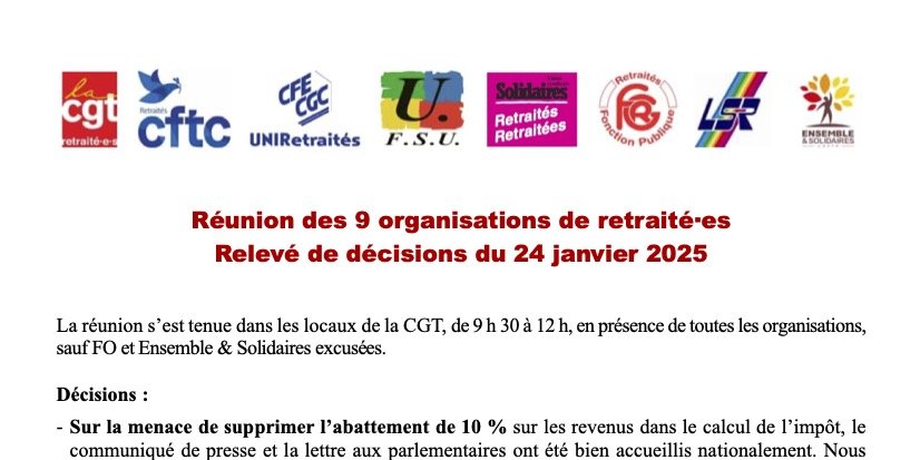 La réunion s’est tenue dans les locaux de la CGT, de 9 h 30 à 12 h, en présence de toutes les organisations, sauf FO et Ensemble & Solidaires excusées.