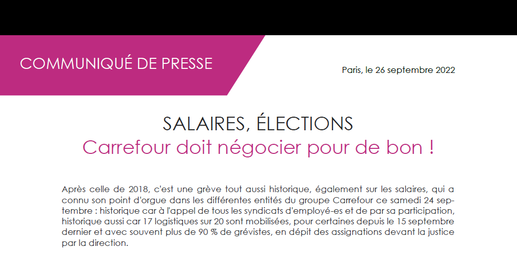 La coordination SUD du groupe Carrefour et sa Fédération SUD Commerce appellent tous les salarié-es du groupe à s'emparer de la journée interprofessionnelle et intersyndicale de grève et de manifestations du jeudi 29 septembre pour donner encore plus de force à leurs revendications et montrer aussi l'exemple car une victoire sur les salaires dans la plus grande entreprise de France ne manquerait pas d'en inspirer d'autres.