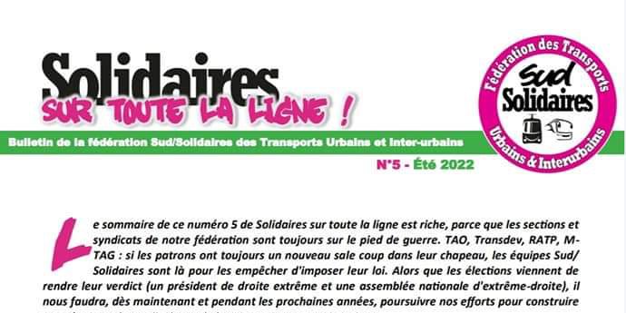Solidaires sur toute la ligne : le bulletin d'informations de la fédération Sud/Solidaires des Transports Urbains et Interurbains. Numéro 5 : été 2022.