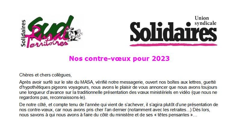 De notre côté, et compte tenu de l’année qui vient de s’achever, il s’agira plutôt d’une présentation de nos contre-vœux, car nous avons pris cher l’an dernier (notamment avec les retraites…) Dès lors, nous savons à qui nous avons à faire du côté du ministère et de ses « têtes pensantes »…