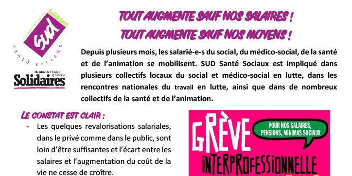 Depuis plusieurs mois, les salarié-e-s du social, du médico-social, de la santé et de l’animation se mobilisent. SUD Santé Sociaux est impliqué dans plusieurs collectifs locaux du social et médico-social en lutte, dans les rencontres nationales du travail en lutte, ainsi que dans de nombreux collectifs de la santé et de l’animation.