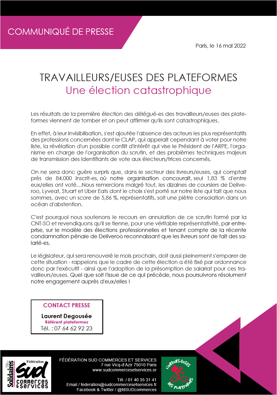C'est pourquoi nous soutenons le recours en annulation de ce scrutin formé par la CNT-SO et revendiquons qu'il se tienne, pour une véritable représentativité, par entreprise, sur le modèle des élections professionnelles et tenant compte de la récente condamnation pénale de Deliveroo reconnaissant que les livreurs sont de fait des salarié-es.