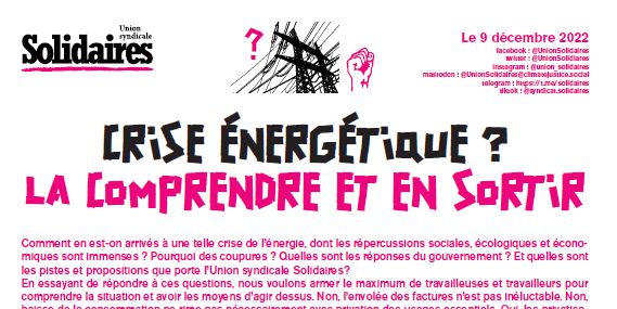 Nous nous y attelons dans l’Union syndicale Solidaires et dans nos syndicats. Notre action collective et nos solidarités dans les mois et années à venir seront déterminantes : pour ne laisser personne souffrir de cette crise énergétique, des factures à venir ou des fermetures d’entreprises, mais engager une mutation profonde et rapide de la production et de la consommation.