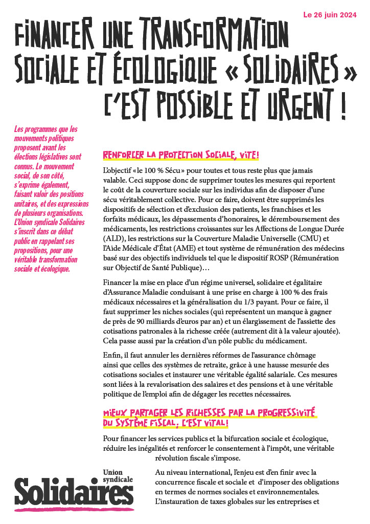Les programmes que les mouvements politiques proposent avant les élections législatives sont connus. Le mouvement social, de son côté, s’exprime également, faisant valoir des positions unitaires, et des expressions de plusieurs organisations. L’Union syndicale Solidaires s’inscrit dans ce débat public en rappelant ses propositions, pour une véritable transformation sociale et écologique.