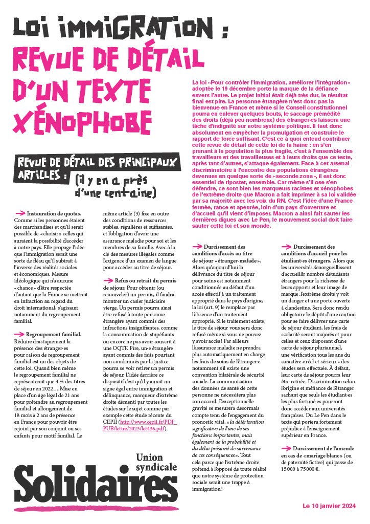 La loi « Pour contrôler l’immigration, améliorer l’intégration » adoptée le 19 décembre porte la marque de la défiance envers l’autre. Le projet initial était déjà très dur, le résultat final est pire. La personne étrangère n’est donc pas la bienvenue en France et même si le Conseil Constitutionnel pourra en enlever quelques bouts, le saccage prémédité des droits (déjà peu nombreux) des étranger-es laissera une tâche d’indignité sur notre système politique. Il faut donc absolument en empêcher la promulgation et construire le rapport de force suffisant. C’est ce à quoi entend contribuer cette revue de détail de cette loi de la haine : en s’en prenant à la population la plus fragile, c’est à l’ensemble des travailleurs et des travailleuses et à leurs droits que ce texte, après tant d’autres, s’attaque également. Face à cet arsenal discriminatoire à l’encontre des populations étrangères devenues en quelque sorte de « seconde zone », il est donc essentiel de riposter, ensemble. Car même s’il ose s’en défendre, ce sont bien les marqueurs racistes et xénophobes de l'extrême droite que Macron a fait imprimer à sa loi validée par sa majorité avec les voix du RN. C’est l’idée d’une France fermée, rance et apeurée, loin d’un pays d’ouverture et d’accueil qu’il vient d’imposer. Macron a ainsi fait sauter les dernières digues avec Le Pen, le mouvement social doit faire sauter cette loi et son monde.