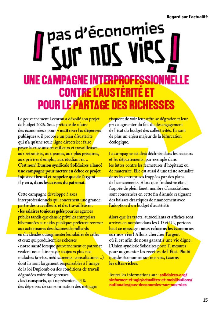 Le gouvernement Lecornu a dévoilé son projet de budget 2026. Sous prétexte de « faire des économies » pour « maîtriser les dépenses publiques », il propose un plan d’austérité qui n’a qu’une seule ligne directrice : faire payer la crise aux travailleurs et travailleuses, aux retraité·es, aux jeunes, aux plus précaires, aux privé·es d’emploi, aux étudiant·es… C’est non ! L'union syndicale Solidaires a lancé une campagne pour mettre en échec ce projet injuste et brutal et rappeler que de l’argent il y en a, dans les caisses du patronat.