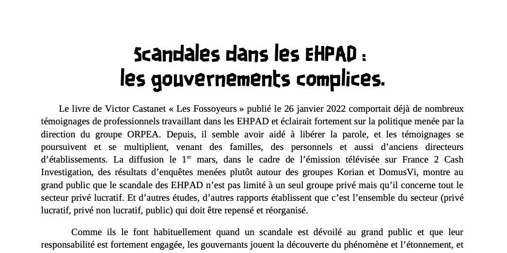 Le livre de Victor Castanet « Les Fossoyeurs » publié le 26 janvier 2022 comportait déjà de nombreux témoignages de professionnels travaillant dans les EHPAD et éclairait fortement sur la politique menée par la direction du groupe ORPEA. Depuis, il semble avoir aidé à libérer la parole, et les témoignages se poursuivent et se multiplient, venant des familles, des personnels et aussi d’anciens directeurs d’établissements. La diffusion le 1er mars, dans le cadre de l’émission télévisée sur France 2 Cash Investigation, des résultats d’enquêtes menées plutôt autour des groupes Korian et DomusVi, montre au grand public que le scandale des EHPAD n’est pas limité à un seul groupe privé mais qu’il concerne tout le secteur privé lucratif. Et d’autres études, d’autres rapports établissent que c’est l’ensemble du secteur (privé lucratif, privé non lucratif, public) qui doit être repensé et réorganisé.